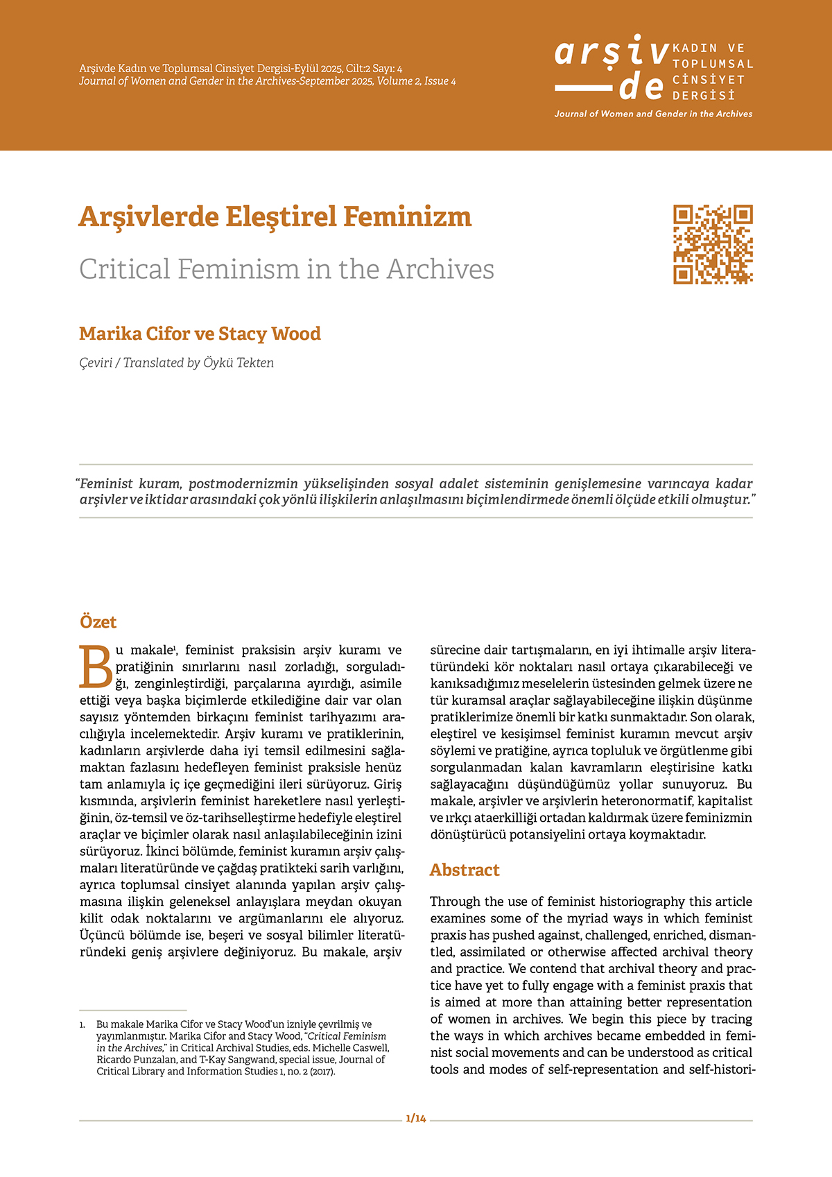 Bu makale, feminist praksisin arşiv kuramı ve pratiğinin sınırlarını nasıl zorladığı, sorguladığı, zenginleştirdiği, parçalarına ayırdığı, asimile ettiği veya başka biçimlerde etkilediğine dair var olan sayısız yöntemden birkaçını feminist tarihyazımı aracılığıyla incelemektedir. Arşiv kuramı ve pratiklerinin, kadınların arşivlerde daha iyi temsil edilmesini sağlamaktan fazlasını hedefleyen feminist praksisle henüz tam anlamıyla iç içe geçmediğini ileri sürüyoruz. Giriş kısmında, arşivlerin feminist hareketlere nasıl yerleştiğinin, öz-temsil ve öz-tarihselleştirme hedefiyle eleştirel araçlar ve biçimler olarak nasıl anlaşılabileceğinin izini sürüyoruz. İkinci bölümde, feminist kuramın arşiv çalışmaları literatüründe ve çağdaş pratikteki sarih varlığını, ayrıca toplumsal cinsiyet alanında yapılan arşiv çalışmasına ilişkin geleneksel anlayışlara meydan okuyan kilit odak noktalarını ve argümanlarını ele alıyoruz. Üçüncü bölümde ise, beşeri ve sosyal bilimler literatüründeki geniş arşivlere değiniyoruz. Bu makale, arşiv sürecine dair tartışmaların, en iyi ihtimalle arşiv literatüründeki kör noktaları nasıl ortaya çıkarabileceği ve kanıksadığımız meselelerin üstesinden gelmek üzere ne tür kuramsal araçlar sağlayabileceğine ilişkin düşünme pratiklerimize önemli bir katkı sunmaktadır. Son olarak, eleştirel ve kesişimsel feminist kuramın mevcut arşiv söylemi ve pratiğine, ayrıca topluluk ve örgütlenme gibi sorgulanmadan kalan kavramların eleştirisine katkı sağlayacağını düşündüğümüz yollar sunuyoruz. Bu makale, arşivler ve arşivlerin heteronormatif, kapitalist ve ırkçı ataerkilliği ortadan kaldırmak üzere feminizmin dönüştürücü potansiyelini ortaya koymaktadır.